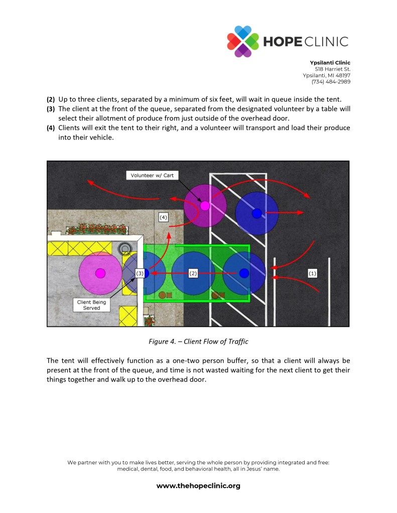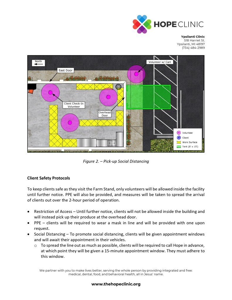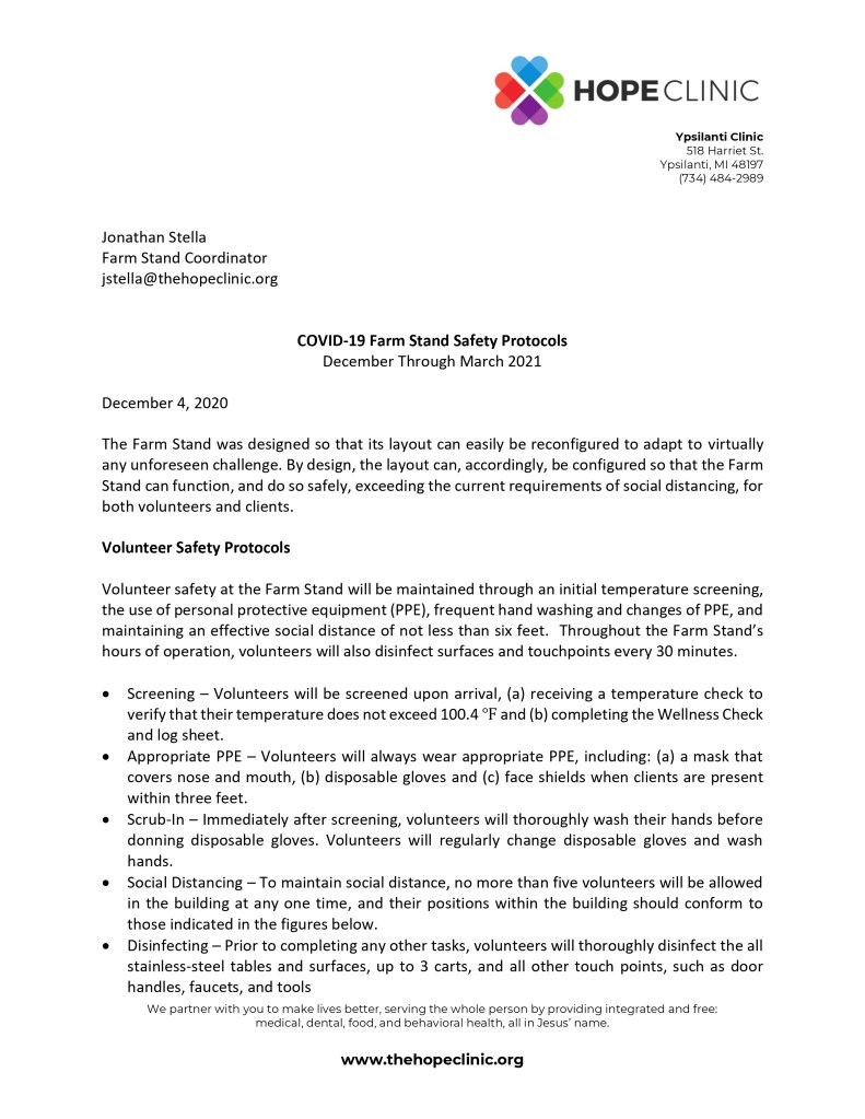 OBJECTIVE: The document outlines COVID-19 safety protocols for the Farm Stand from December 2020 to March 2021, and emphasizes measures to ensure the safety of volunteers and clients. It details procedures for volunteer safety, including initial temperature screenings, mandatory use of personal protective equipment (PPE), frequent hand washing, maintaining social distance, and disinfecting surfaces. Client safety protocols include restricting access to the facility, providing PPE, enforcing social distancing through appointment windows, and minimizing contact during produce pickup. The document includes diagrams illustrating volunteer positioning and client traffic flow to enforce these safety measures. (Click here for more details.)