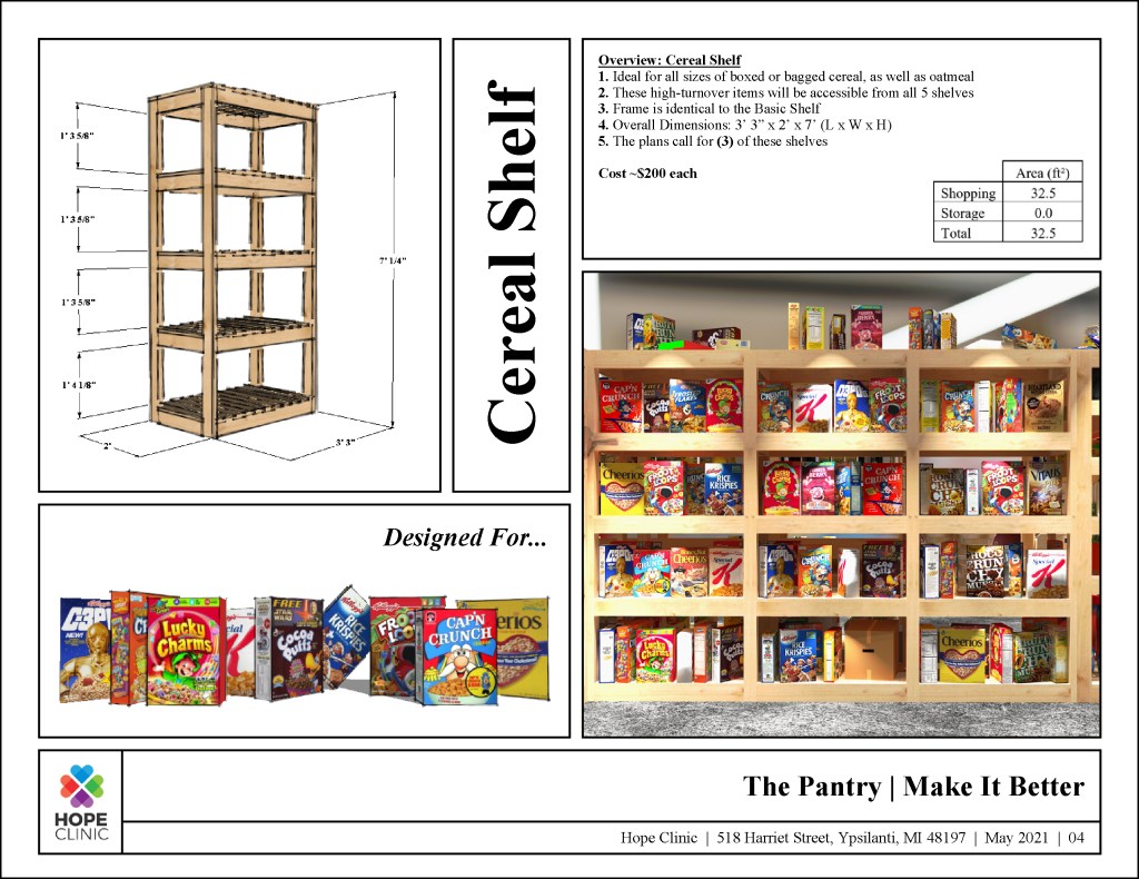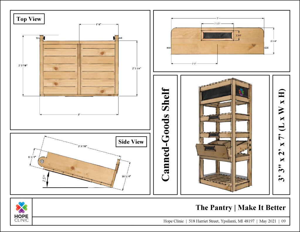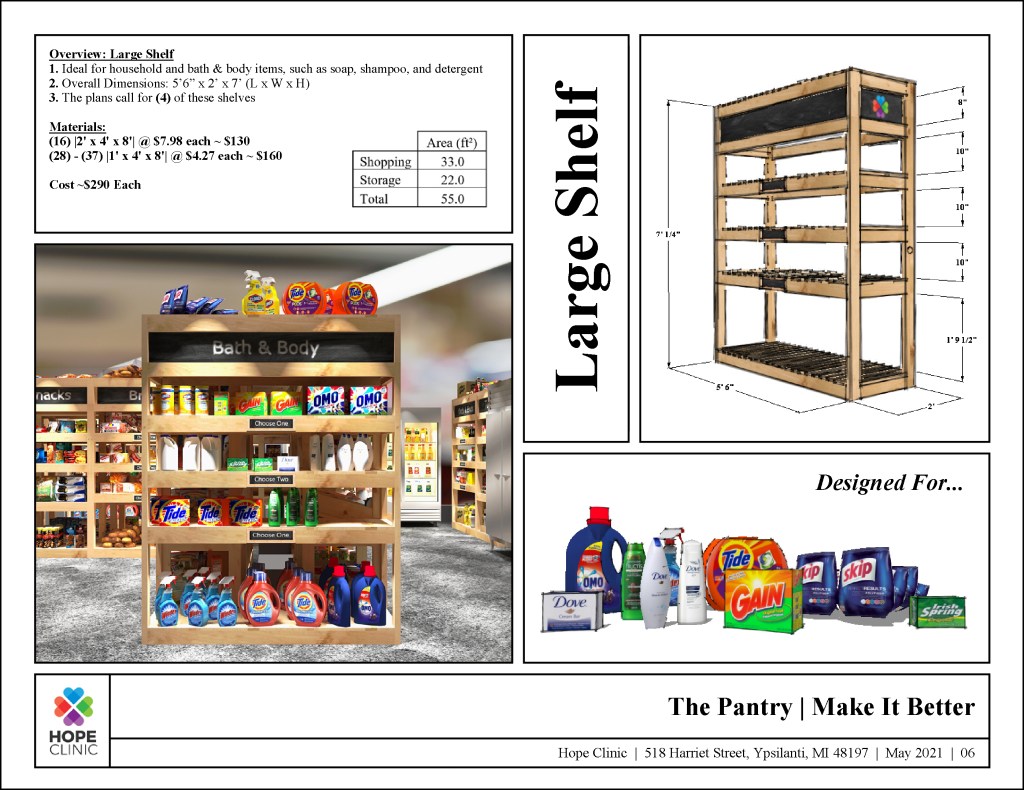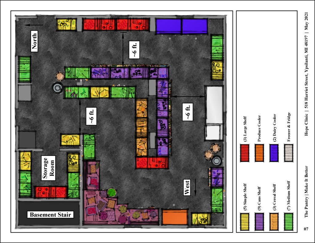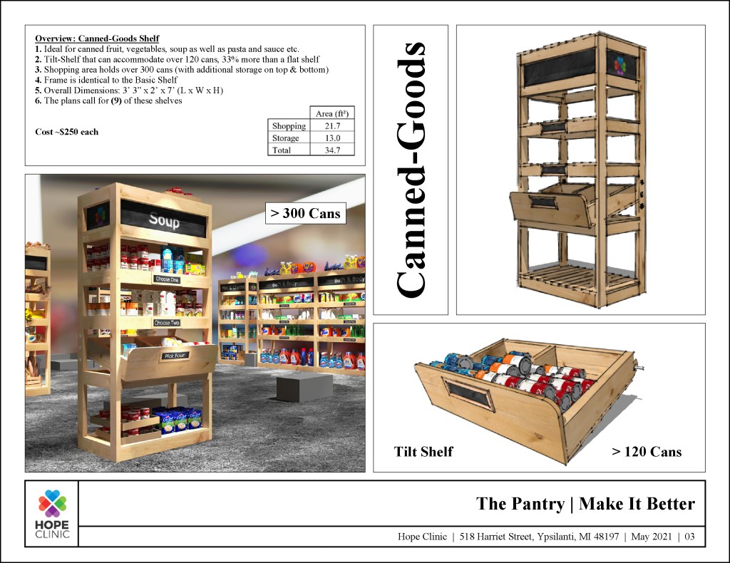 OBJECTIVE: The objective of this project was to reimagine the layout of Hope Clinic’s food pantry, an effort which sought to maximize the utilization of the limited space available, and to simplify what was a notoriously chaotic pattern of traffic for clients. Several potential layouts were analyzed by this designer, each built around different combinations and arrangements of four basic, custom shelving units that were themselves ergonomically designed for ease of access and the accommodation of specific items, such as canned goods, cereals, and larger household products. (Click here for more details.)