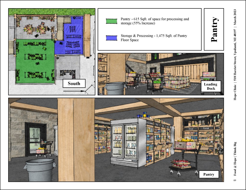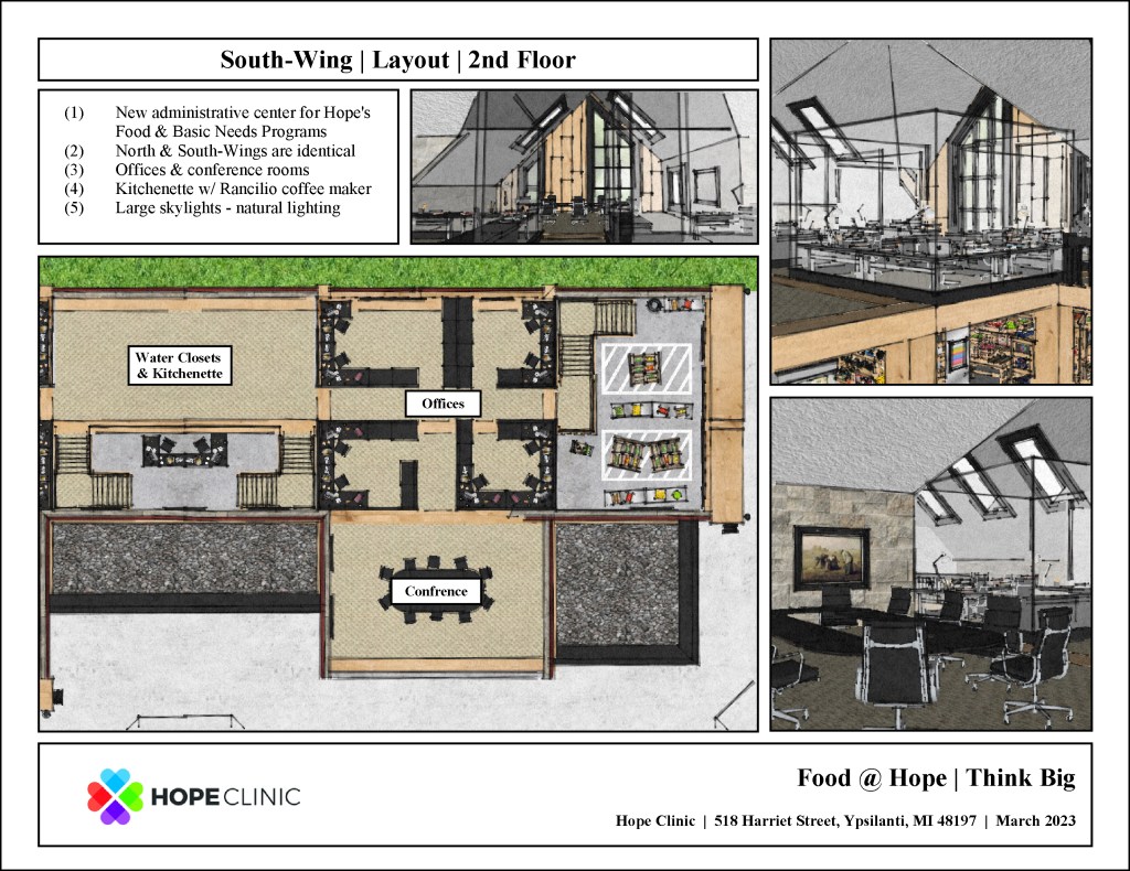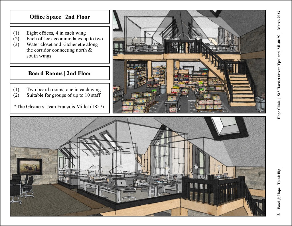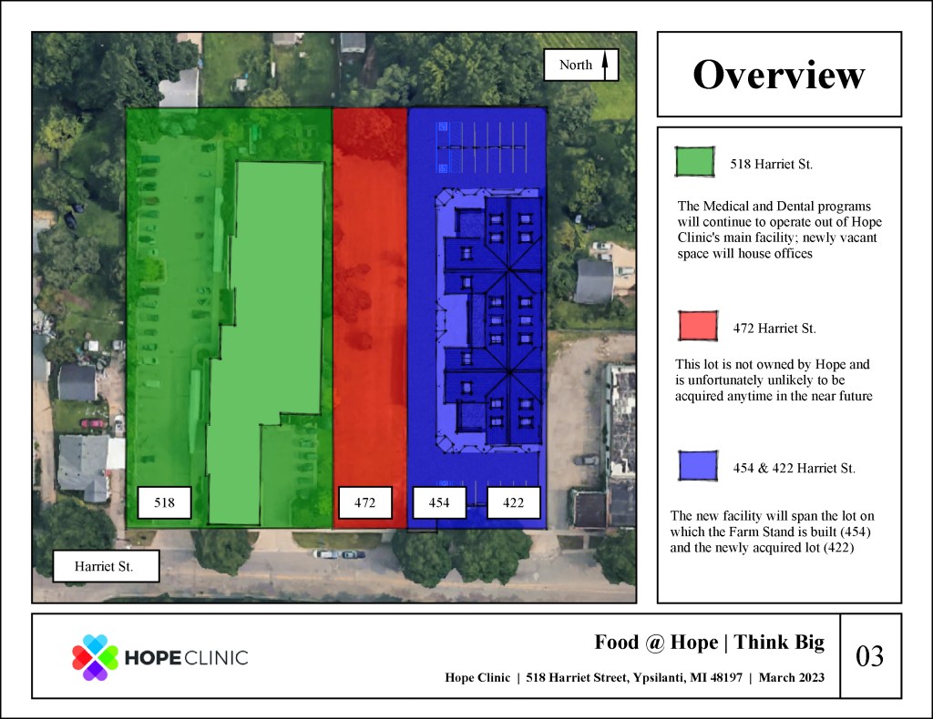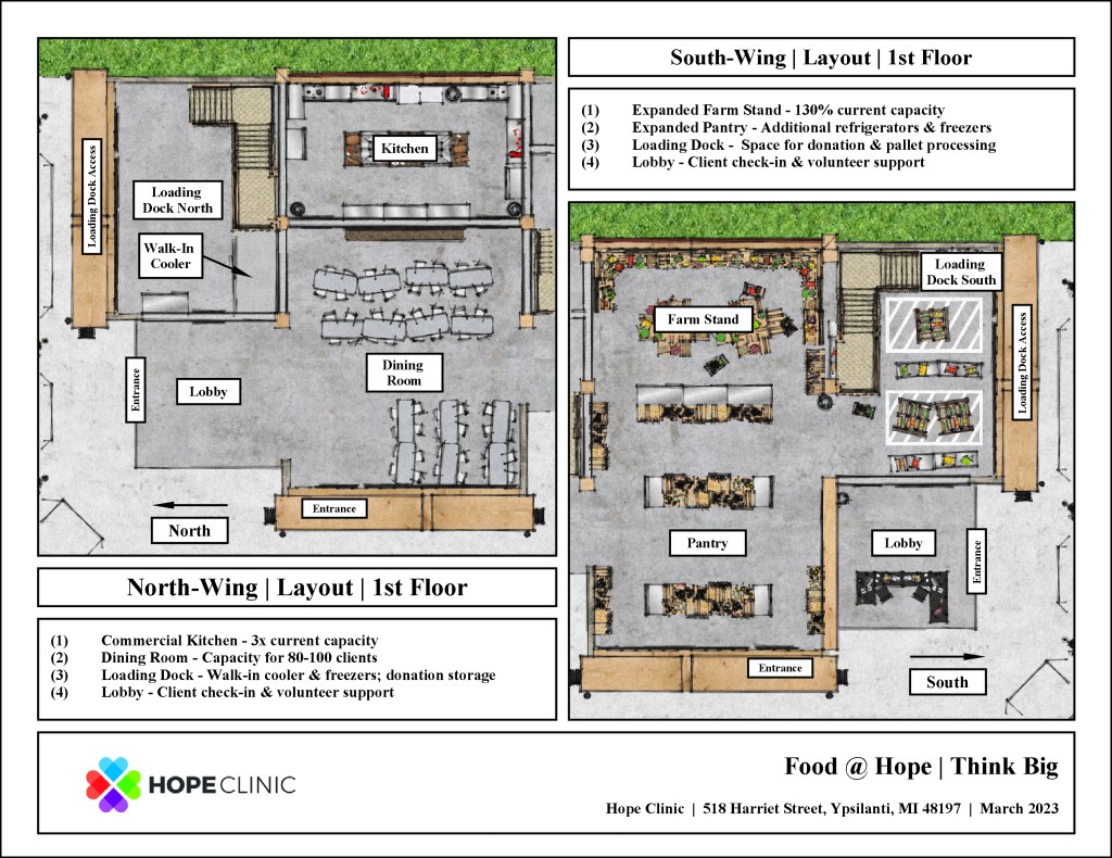 OBJECTIVE: As a provider of a comprehensive constellation of complementary health services, space in which to house Hope Clinic’s various programs has always posed a significant challenge. With the recent acquisition of an adjacent, undeveloped property, the potential for transformational expansion has become a reality. Toward that end, Hope’s management solicited a proposal for what might be possible were one to “Think Big.” This project is the result of that invocation. With 15 years of experience, first as a volunteer and then as a member of staff, this designer leveraged an intimate knowledge of the operation of Hope’s Food and Basic Needs programs to envision a solution in which the physical space allocated for all of Hope’s programs would be expanded so that Hope could better keep pace with the ever-increasing need for such services. This proposal envisions the relocation of the set of programs subsumed under the title of Food and Basic Needs to an entirely new facility, which would occupy both the newly acquired property, and that on which the Farm Stand currently stands. (Click here for more details.)